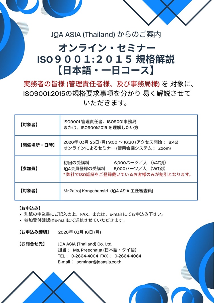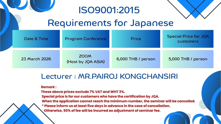 We have pleasure in informing you that JQA ASIA (Thailand) will hold the Web Seminar “ISO9001:2015 Requirements for Japanese”