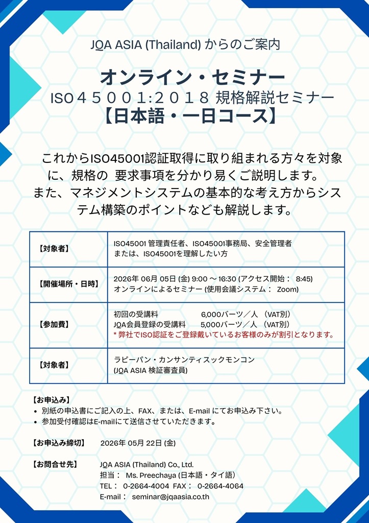 We have pleasure in informing you that JQA ASIA (Thailand) will hold the Web Seminar “ISO45001:2018 Requirements for Japanese”