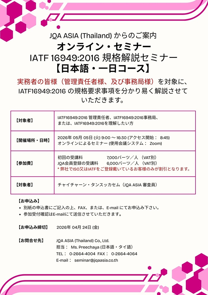 We have pleasure in informing you that JQA ASIA (Thailand) will hold the Web Seminar “IATF16949:2016 Requirements for Japanese”