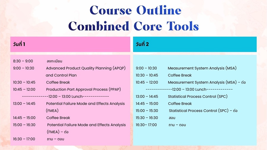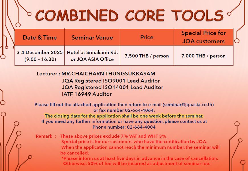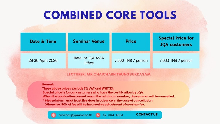 ทางบริษัทฯขออนุญาตประชาสัมพันธ์การอบรม หลักสูตร Combined Core Tools โดยมีรายละเอียดการอบรมดังต่อไปนี้