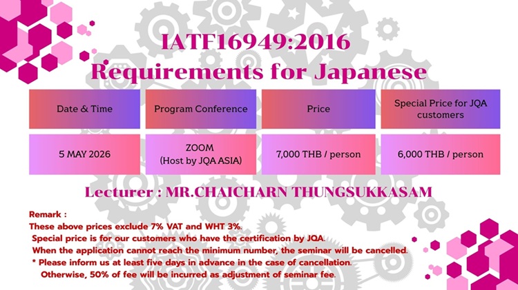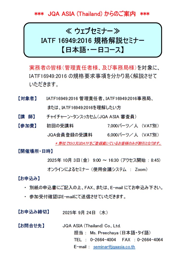 We have pleasure in informing you that JQA ASIA (Thailand) will hold the Web Seminar “IATF16949:2016 Requirements for Japanese”