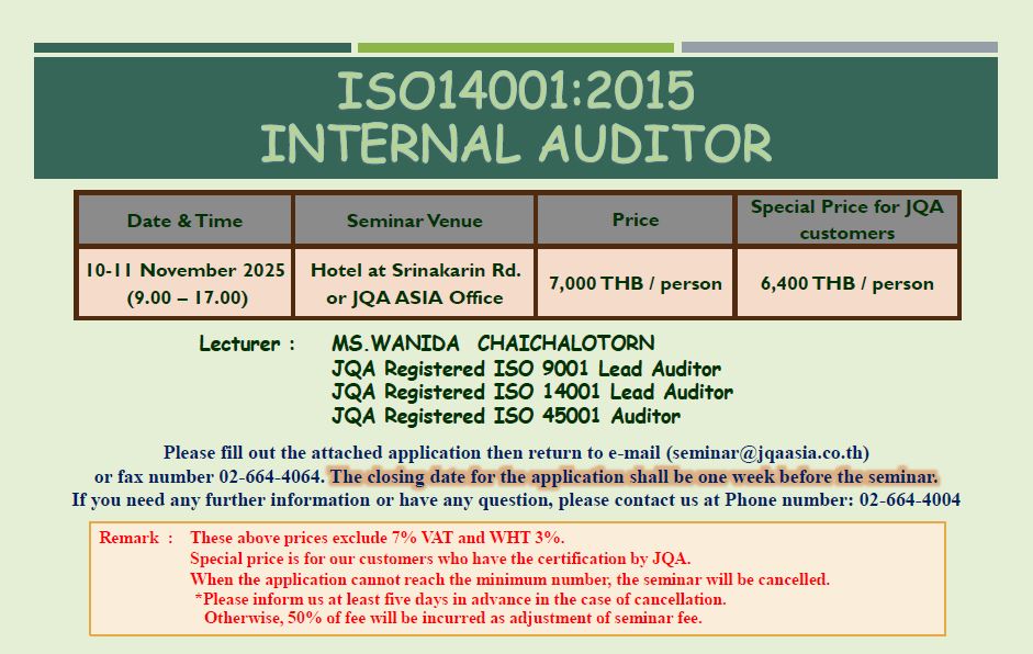 ฝ่ายฝึกอบรม โทร. 02-664-4004 หรือ E-mail: seminar@jqaasia.co.th