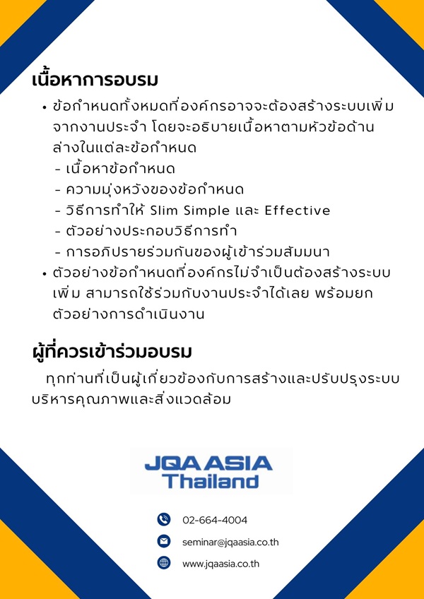 ฝ่ายฝึกอบรม โทร. 02-664-4004 หรือ E-mail: seminar@jqaasia.co.th