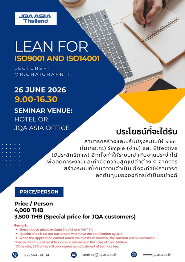 ทางบริษัทฯ ขออนุญาตประชาสัมพันธ์การอบรมหลักสูตร LEAN For ISO9001 and ISO14001 (Thai Language) โดยมีรายละเอียดการอบรมดังต่อไปนี้