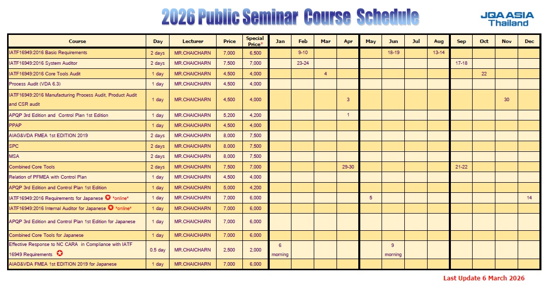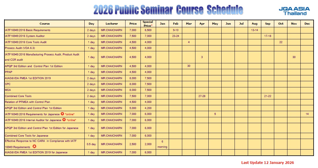 สำหรับลูกค้าซึ่งได้รับการรับรองระบบมาตรฐานทุกระบบของบริษัท เจคิวเอ เอเชีย (ประเทศไทย) จำกัด จะได้รับราคาพิเศษสำหรับการอบรมแบบ Public Seminar ทุกหลักสูตร ตามราคาที่ระบุไว้ในตารางการอบรม